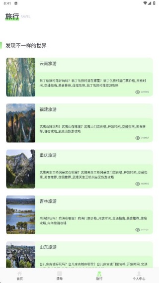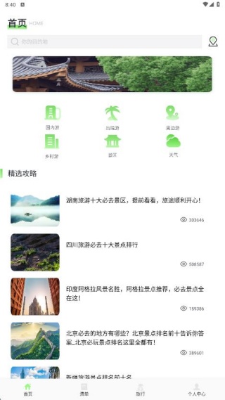 1、首页上新了大量精选攻略,同时涵盖国内游、出境游、周边游、乡村游、景区查询、天气查询等实用功能。