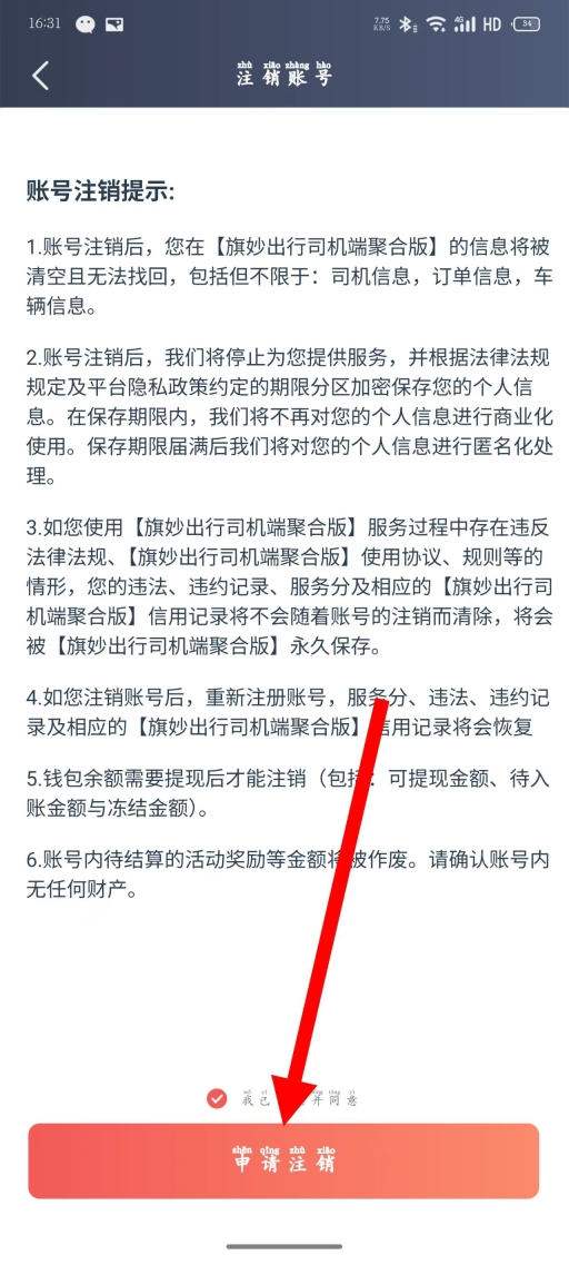 5、仔细阅读账号注销提示内容后,勾选同意相关条款的选项,点击申请注销按钮,再依据页面提示完成后续的操作步骤。
