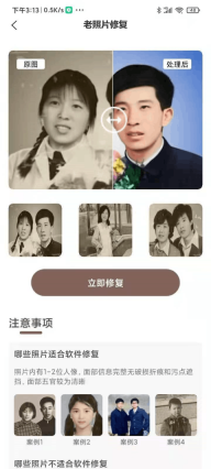 【照片修复大全】借助人工智能修复技术,能够对模糊、低清的照片以及带有斑驳痕迹的照片进行修复,还专门针对面部实现了高清还原修复,助力您重拾珍贵的记忆。