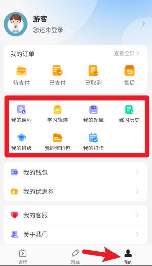 1进入“我的”页面后,你可以查看订单状态、学习记录以及题库数据,点击任意一个图标就能进入对应的功能模块。