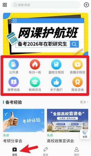 2、点击课程后,能借助分类按钮挑选课程类型,同时也能查看公开课、每日一练、报名咨询等多种不同的入口。