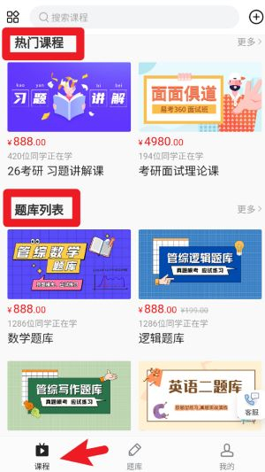 3在热门课程与题库展示区,系统会呈现当前最受用户欢迎的学习资源。若您对某一课程或题库感兴趣,只需点击其封面图,即可跳转至详情页面,在那里您能清晰了解该资源的定价信息以及已有多少用户参与学习。