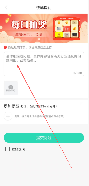 2、之后在快速提问页面中,输入问题详情和图片等内容之后点击提交问题即可。
