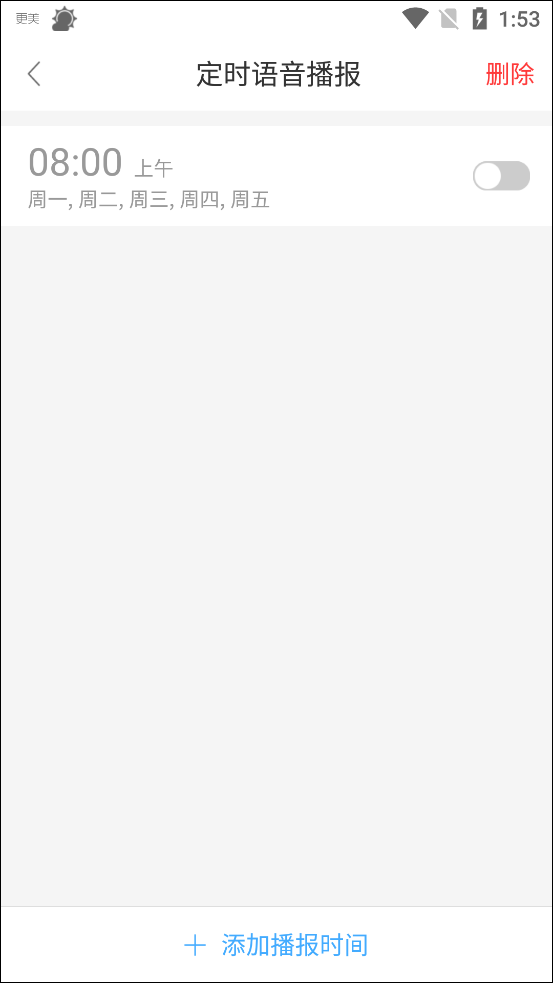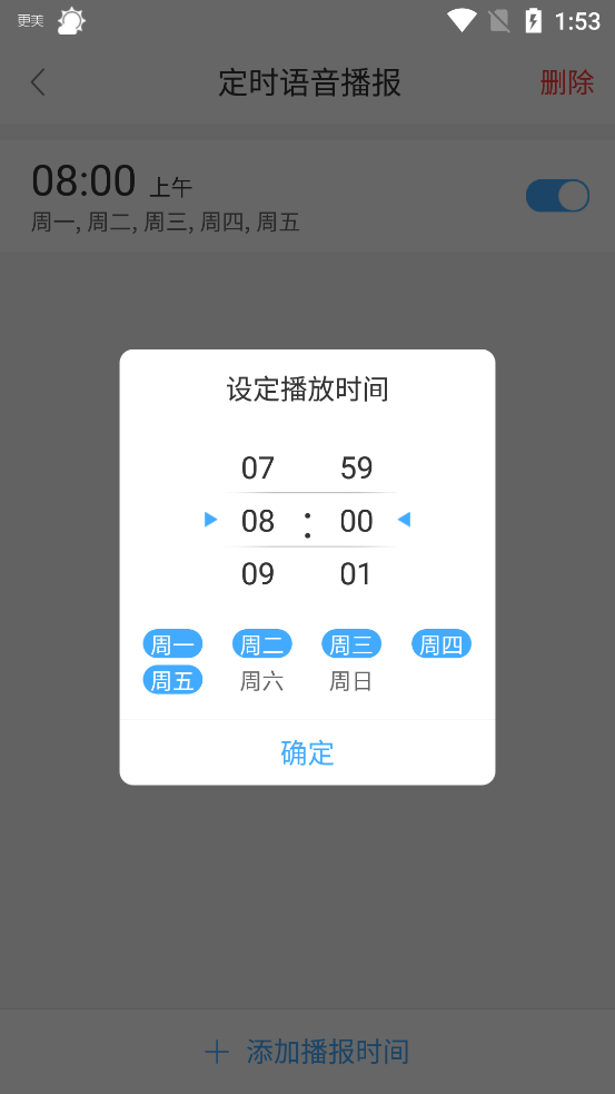 2完成后进入语音播报页面,该页面默认在工作日的早上进行播报,用户也能够自行添加其他播报时间。