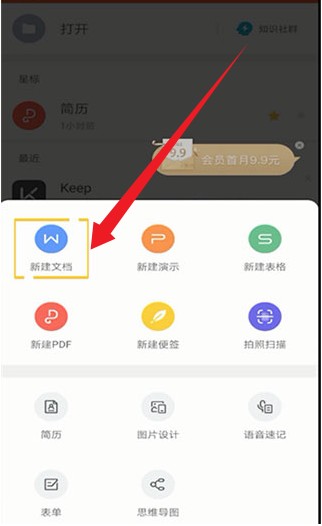 2、弹出的功能界面中选择 “新建文档” 选项,进入文档创建页面。