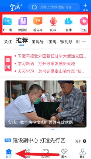 2、在首页可以浏览推荐内容,点击顶部图标能够快速进入广播、读报纸、电视、问政等功能模块。
