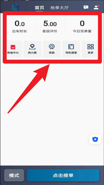 2、登录成功后进入首页,可以查看自己的出车时长、星级评分和今日完成订单量,并可快速进入权益中心、奖励、司机课堂等常用功能模块。