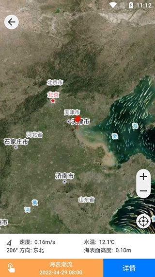 4进入探索页面后,通过定位功能结合地图界面确定自身所在位置的潮汐情况,点击详情按钮即可查看该地点的气象、潮汐、海浪、表层洋流、深层洋流及微生物等多维度信息。