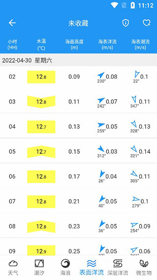 6、数据地图功能,可用于查看全球范围的海表潮流、流速、流向、水温及海表面高度等信息;点击详情后,还能进一步查看天气、潮汐、海浪、表层洋流、深层洋流以及微生物相关数据。