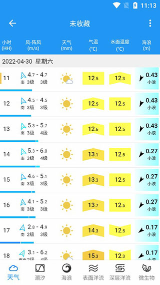 8第八项是查看天气相关的各项信息,包括逐小时的天气状况、风力与阵风情况、具体的天气现象、实时气温、水面的湿度数据以及海浪的状态。