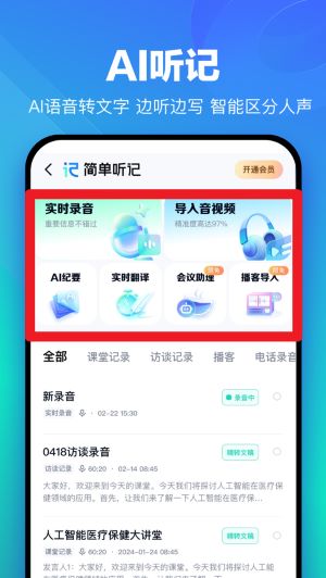 4、在听记页面中支持AI实时录音、导入音频转写、会议纪要整理等功能,帮助用户高效记录信息。