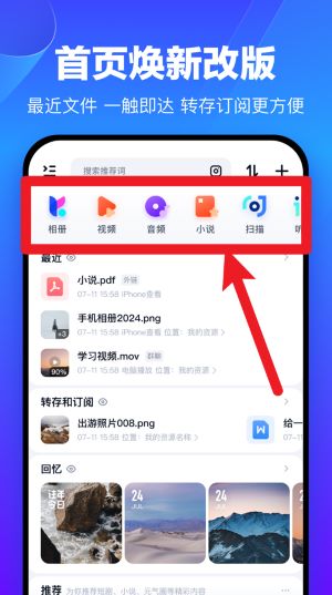 2、在新版首页界面中,可通过顶部快捷入口快速访问相册、视频、音频、小说和扫描等常用模块。
