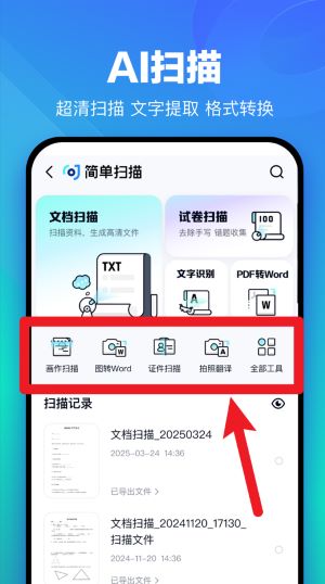 3、点击扫描功能进入后,提供图片扫描、文档转Word、证件扫描和拍照翻译等多项AI智能工具。