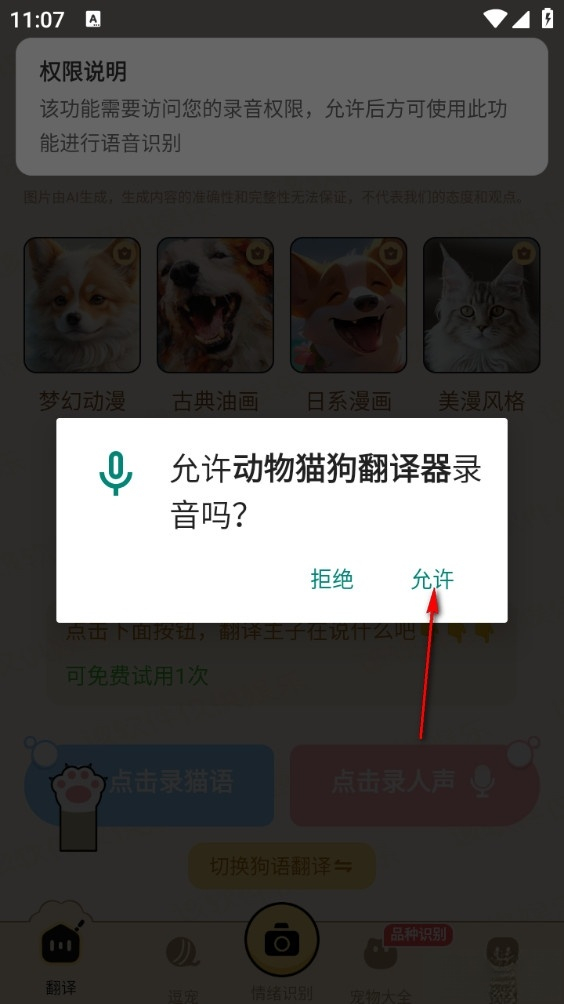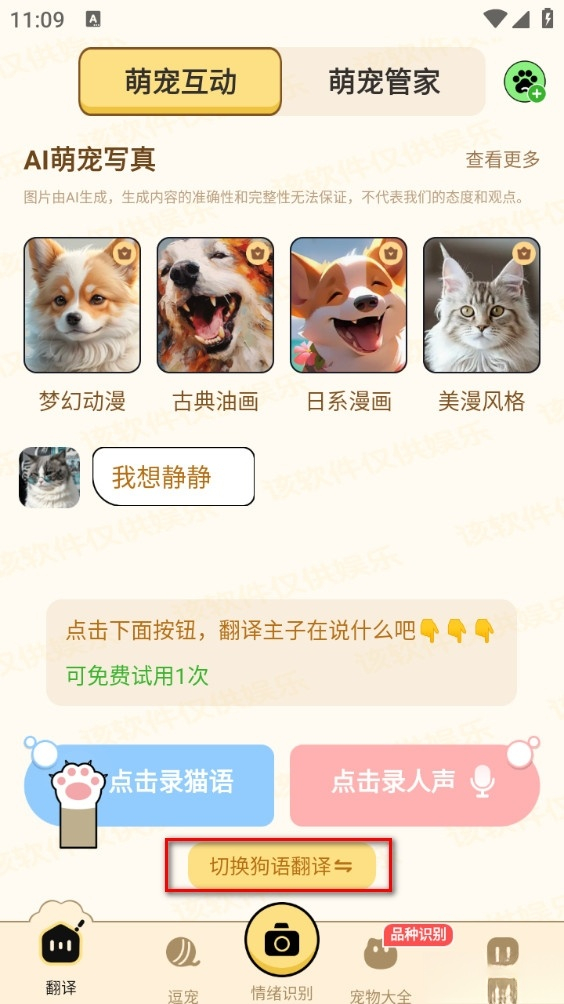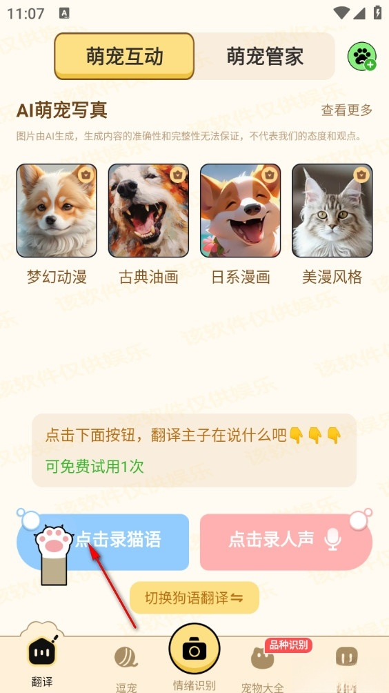 有一款针对宠物主人开发的应用,能实现不同宠物语言间的转换,使用时只需开启设备的录音功能即可。此外,它还包含宠物情绪分析、舒缓音频等趣味模块,全方位适配养宠人群的各类使用场景。