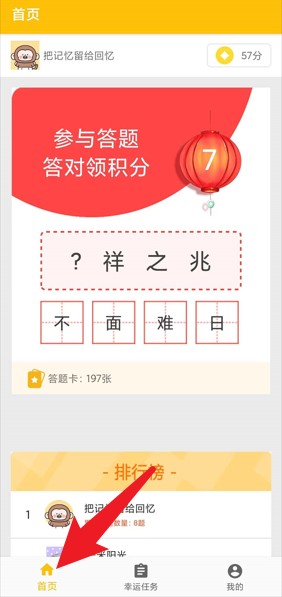 2、首页展示当前题目、积分及排行榜情况,参与答题可获取奖励积分和排名提升。