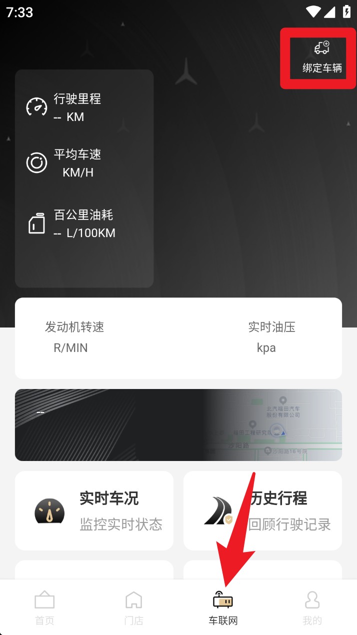 3. 在车联网页面点击右上角绑定车辆,即可同步查看行驶里程、油耗等实时数据,帮助你掌握车辆状态。