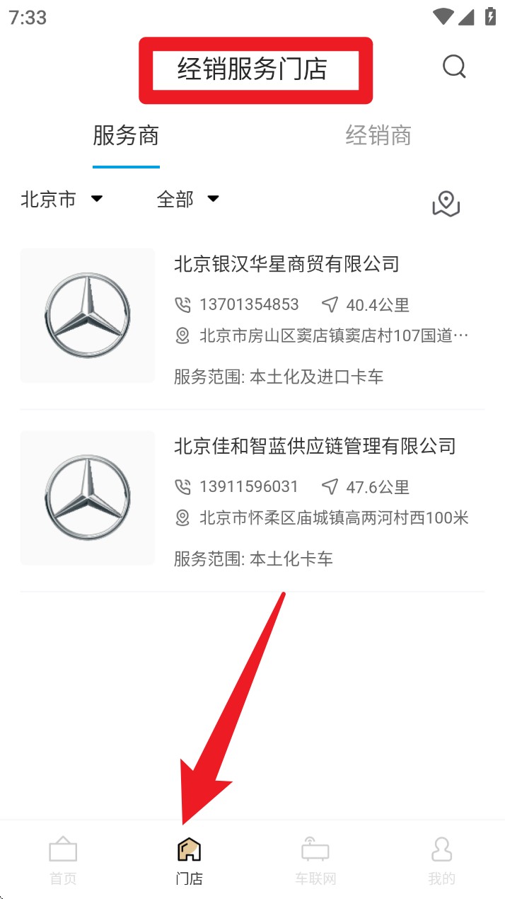 2. 切换至底部菜单栏的门店,可浏览附近经销服务商门店信息,支持查看服务范围,并可直接导航前往。