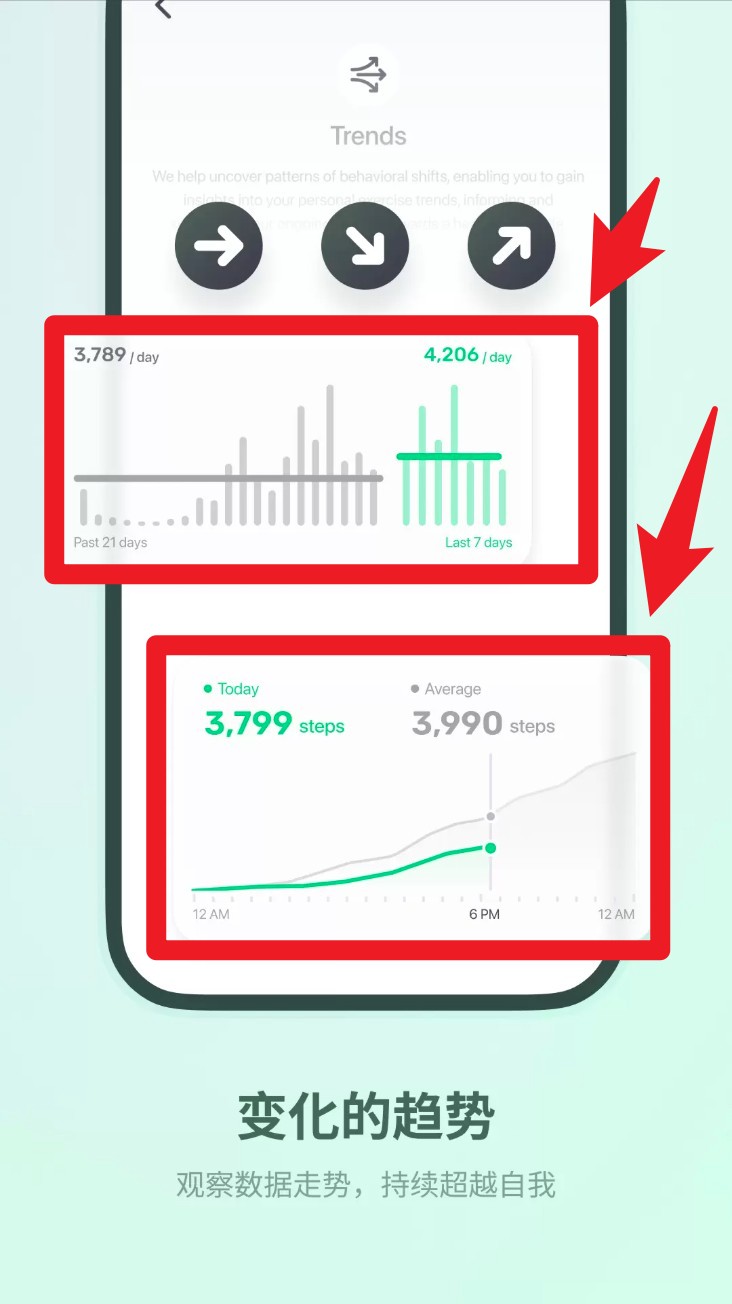 2、进入「Trends」标签页后,可查看过去7至21天的运动趋势图表,借此了解每日步数的变化情况,以及当前步数与平均步数的对比信息。