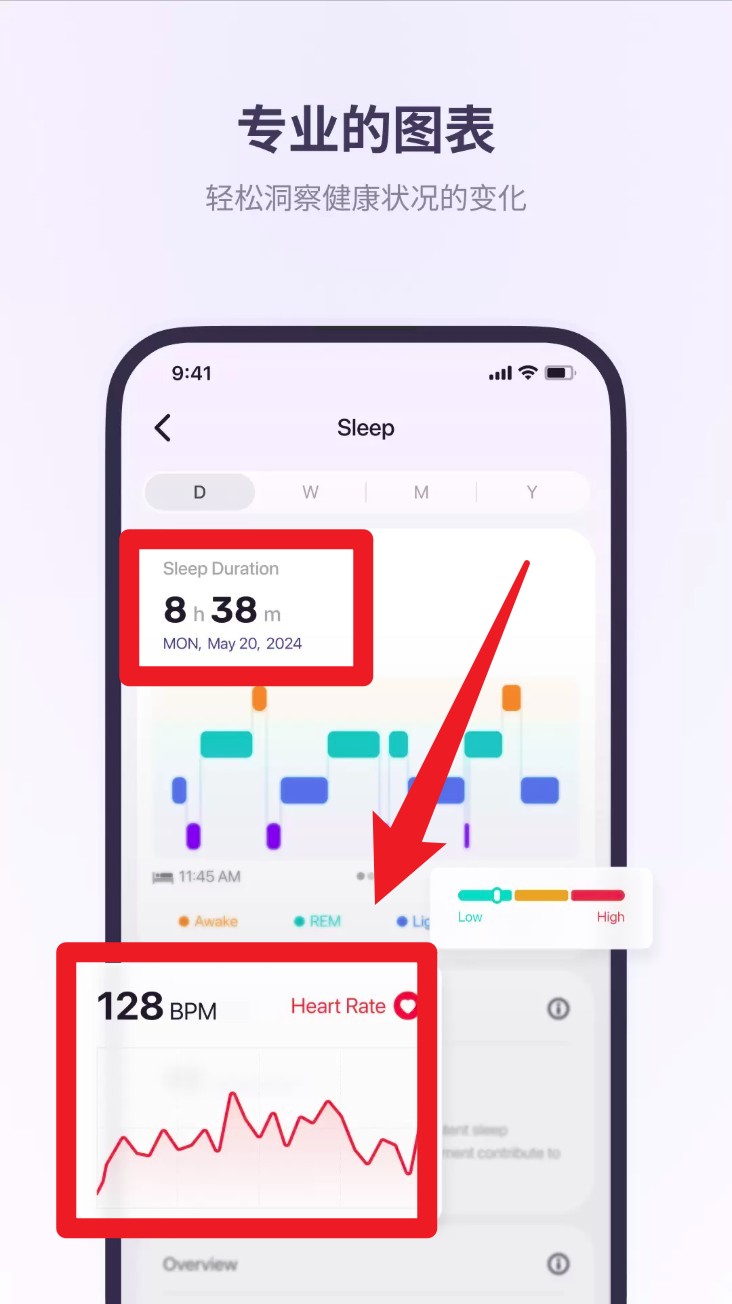 打开App后进入「Sleep」页面,能查看前一晚的总睡眠时长以及各阶段的分布情况,下拉页面还可以查看心率变化曲线。