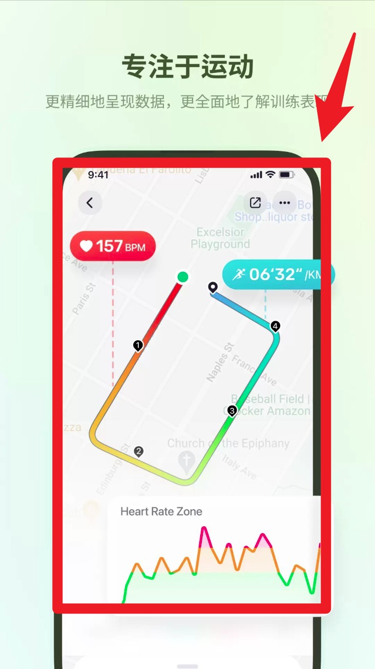 3、打开「运动记录」界面后,就能看到配速和心率在地图上的变化轨迹,这有助于你评估训练效果以及强度分布情况。