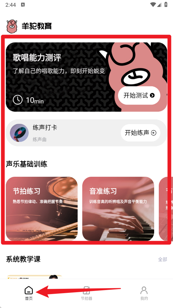 3、进入首页后,你可以开展歌唱能力测评、练声打卡、音准练习以及节拍练习,这些功能能够助力你提升唱歌水平。