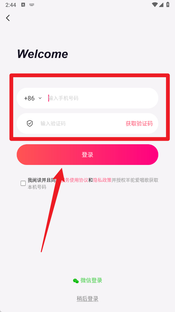 2、登录页面支持两种登录方式:一种是输入手机号,获取并填写验证码后点击登录;另一种是直接选择微信账号登录。