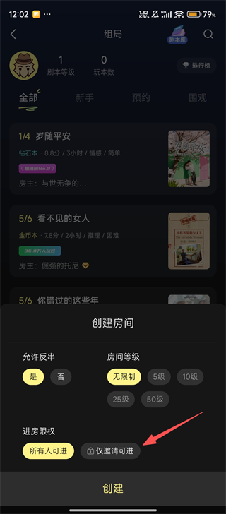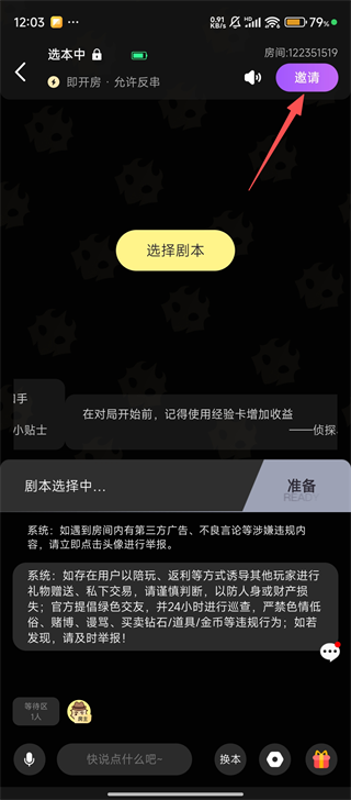4私人房间创建完成后,点击页面右上角的邀请按钮,即可邀请好友进入该房间共同体验剧本游戏。