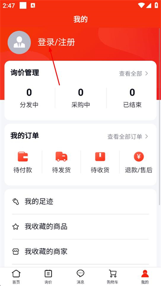 2、进入个人页面后,找到并点击“登录注册”选项,即可跳转至登录账号页面。