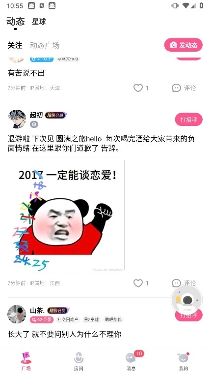 在广场页面浏览动态和星球,还能进入房间参与交友扩列、蒙面交友、附近的人、推荐、电台直播、相亲交友、好声音等各类活动。