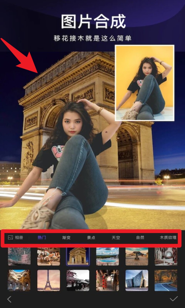 1. 选择图片合成功能后,从底部素材分类中挑选背景模板,点击导入人物照片即可自动融合进新场景。