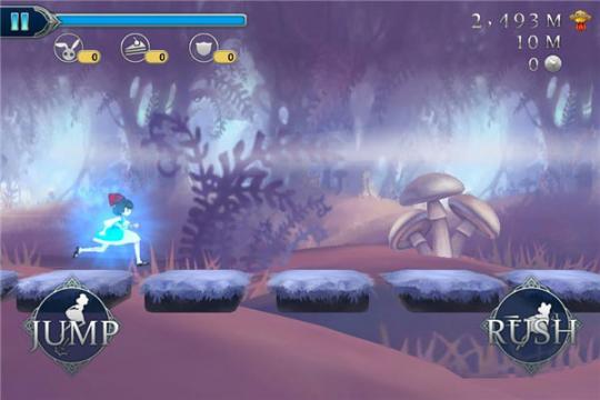 游戏的操作非常简单,玩家只需点击屏幕即可完成所有必要动作。左侧的虚拟按键JUMP用于跳跃,长按可以让爱丽丝持续飞行;右侧的RUSH键用于冲刺,不仅能加快移动速度,还能撞开阻挡的障碍物。