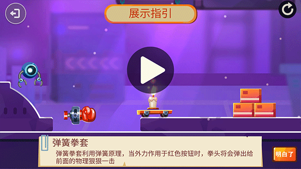 2. 第二关正式开启,点击位于最左边的小球机器人。当它转变为小球并滚动到放大镜旁边的时候,借助放大镜光的折射引发物理反应。一旦小球触动开关,让最右侧的旗帜升起,即可成功通过此关。