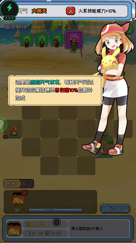 9、同时,上方会展示当前的天气状况,每种天气能为对应属性精灵的总伤害提供10%的额外加成。