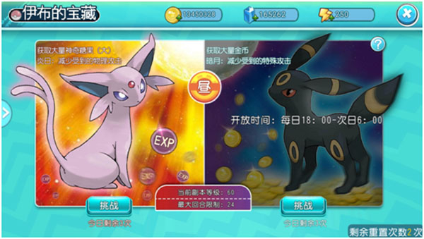 伊布的宝藏划分为太阳和月亮这两种类型。太阳宝藏有着较强的防御能力,玩家成功挑战后会掉落精灵经验道具;月亮宝藏则具备较高的特防能力,战胜它可获取大量金币。在每日特定时段,玩家只要参与挑战,就能收获丰厚的资源奖励。当玩家等级达到35级、40级以及50级时,副本难度会随之提升,相应的,奖励也会更加丰厚。