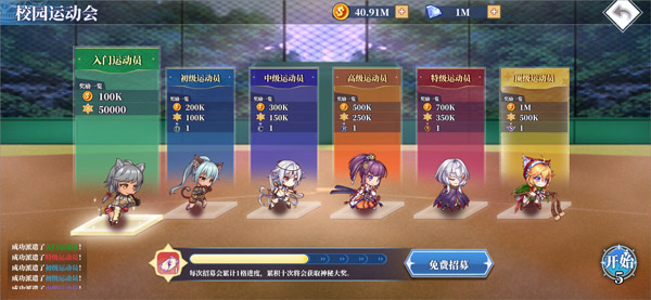 身为老师,同时作为班级的组织者,每次比赛时,你有权指派并集结5名运动员组成阵容参赛。默认情况下,每次比赛都是“入门”运动员上场。不过,你能够消耗钻石重新随机招募1名运动员。而且每隔一段时间,还会有免费招募的机会。如此操作,直到组建出一支完美的团队去参赛!
