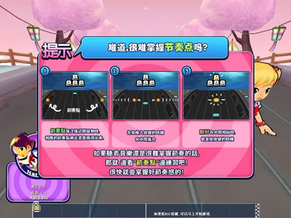 究竟何时按下按键呢?玩音游讲究的就是“恰到好处”。所以,就在两个节奏点恰好重合的时候按下吧!从角色的视角来说,当障碍物来到角色跟前,与之接触的那一瞬间按下,这是最为合适的。