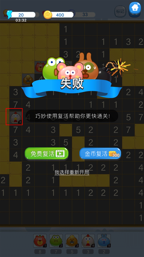 7、当你遇到高等级的怪兽而经验值不够时,就会闯关失败,需要重新开局。