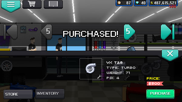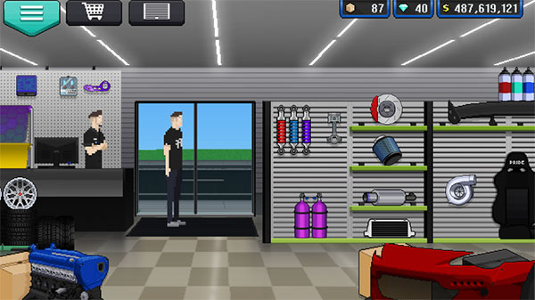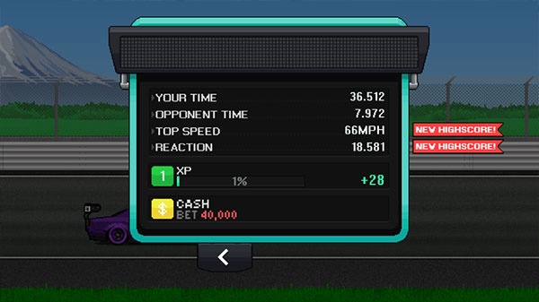 在像素赛车手的最新版游戏中,最先能察觉到整体上的变化。现在进入车库、商店等场景时,都会出现一种类似翻页效果的过场动画。此外,游戏帧数有所提升,玩起来比以前更加流畅。