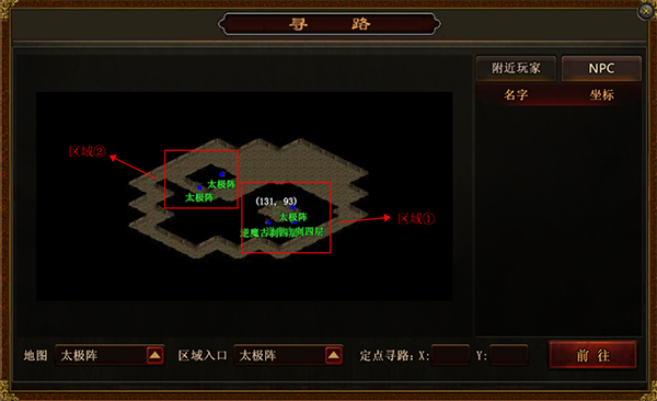 正常行进路线:传送到下一层地图后,优先进入区域①。区域①中有四个门,分别通往逆魔古刹四层和太极阵。排除刚进入区域①时所经过的门,接着走进下一个标有太极阵的门,便会抵达区域②。在区域②中,选对门就能进入下一层地图。如此重复操作,直至区域②出现封魔堂传送门,此时进入封魔堂,就可正常向下传送。(需注意,如果在太极阵内选择进入逆魔古刹四层的门,将会被传送回四层,一切需重新开始。)