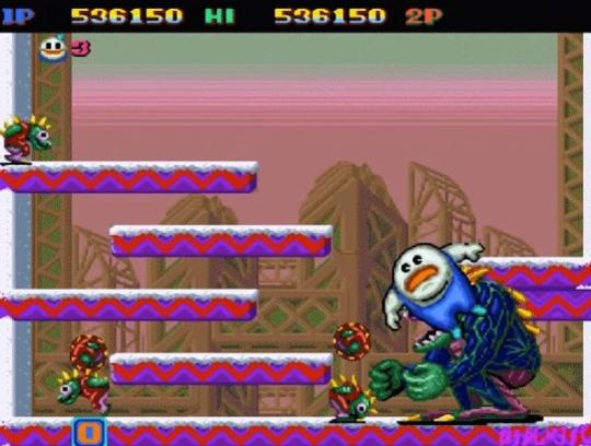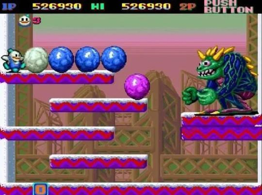 3、《雪人兄弟》有一个比较有意思的设定,玩家只要能够坚持一段时间就可以直接过关,BOSS打不打死都无所谓。小编尝试过在不清敌兵的情况下,直接跳到BOSS背后使用普通攻击。然而一直拖到过关BOSS都没有被打死,也就是说BOSS很有可能是无法使用子弹打死的。但真的是这样吗?