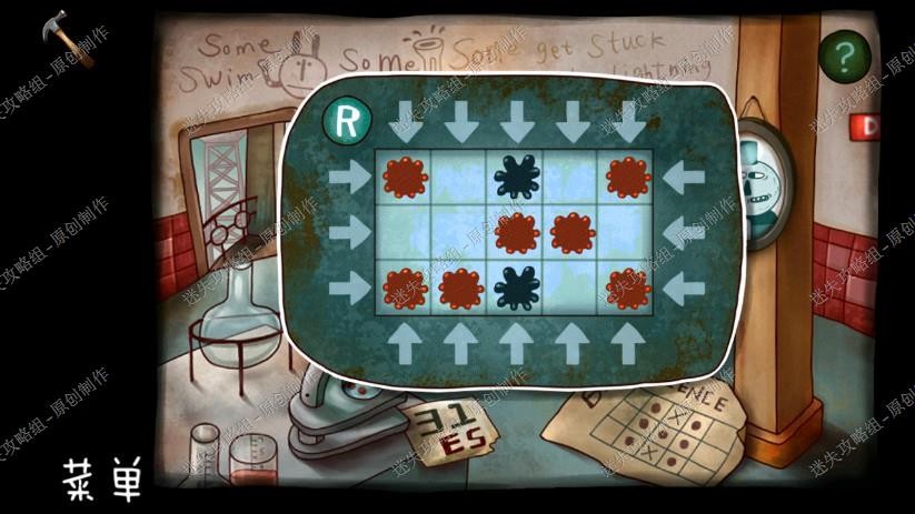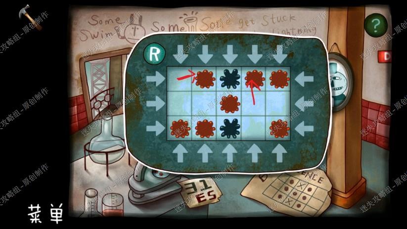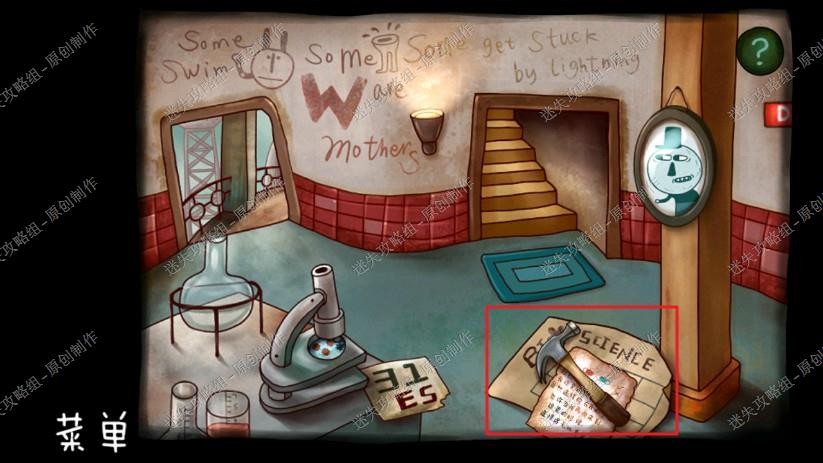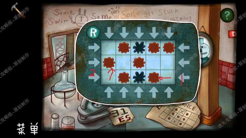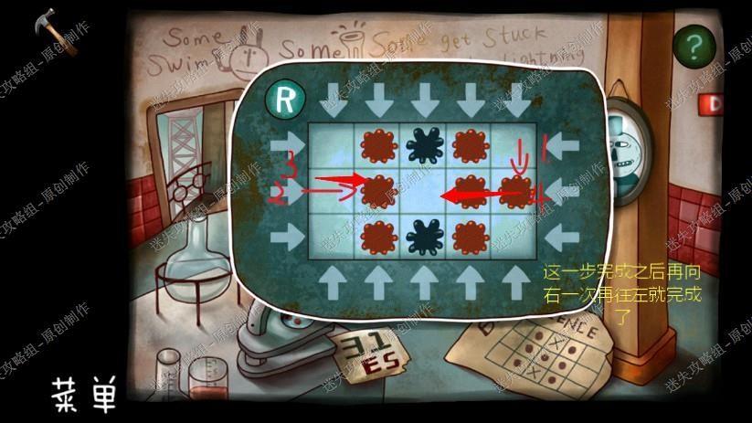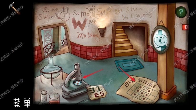 5. 我们来到实验室先把右下角的锤子和记忆碎片拿走,点击显微镜根据右边地上的线索完成排列游戏,步骤如图,完成后上楼。
