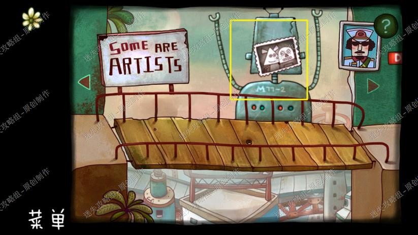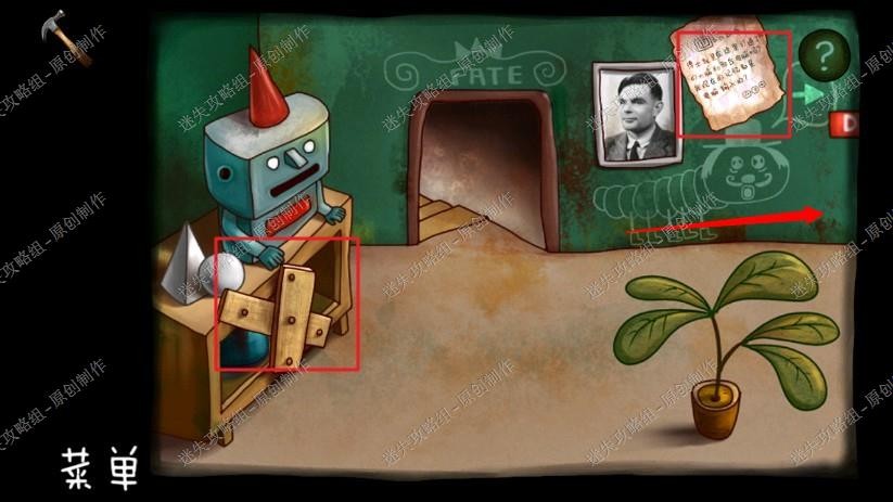 16. 回到机器人工坊,我们把地上的螺丝刀,墙上的日记拿走,根据手册里的线索密码,用螺丝刀打开,拿到电池。