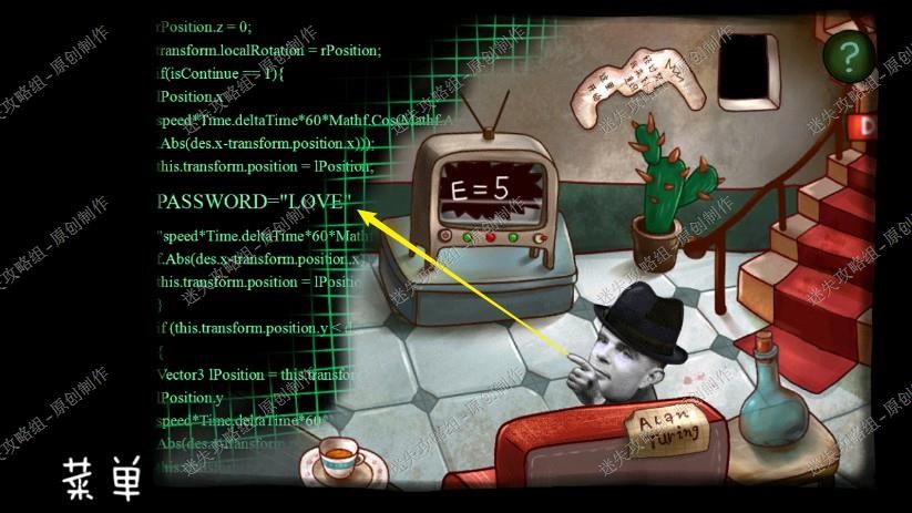 15. 在楼下我们在墙上拿到记忆碎片,把电视机调到第一章中的(绿红绿向右)获得木马E=5,顺着人物的手指我们看到了密码love=1975,回到宿舍顶上。