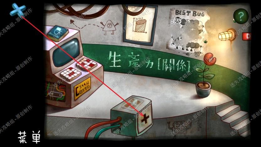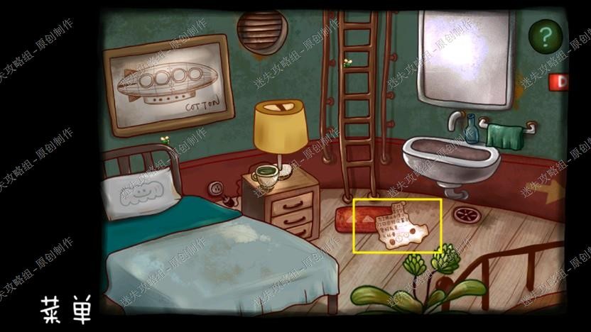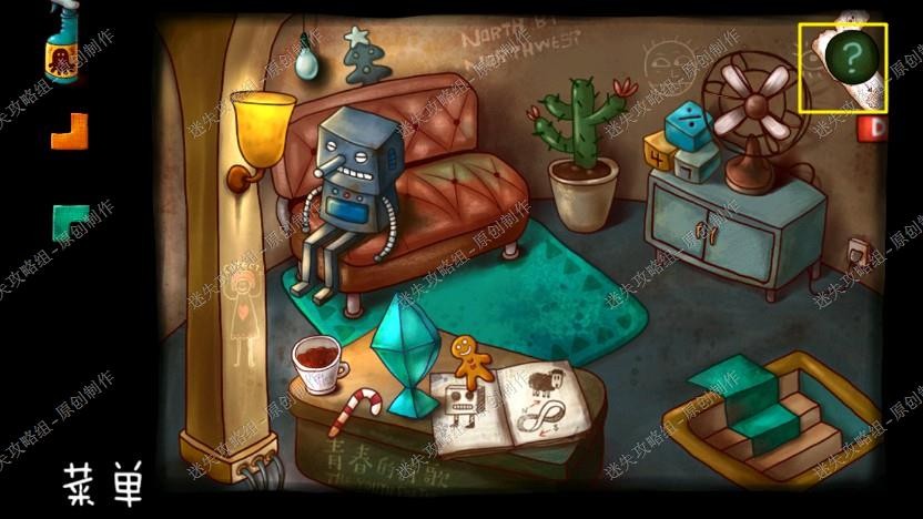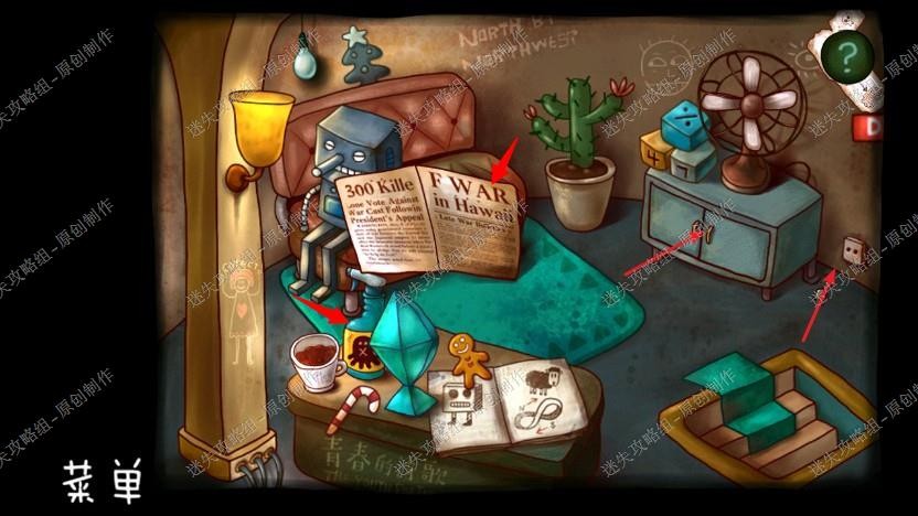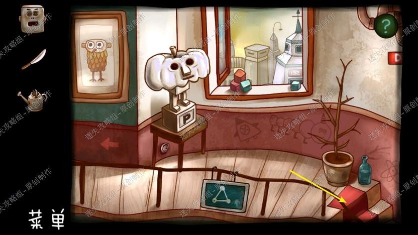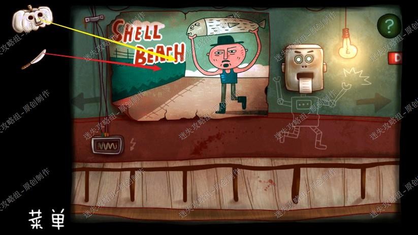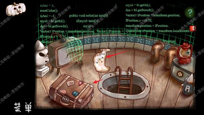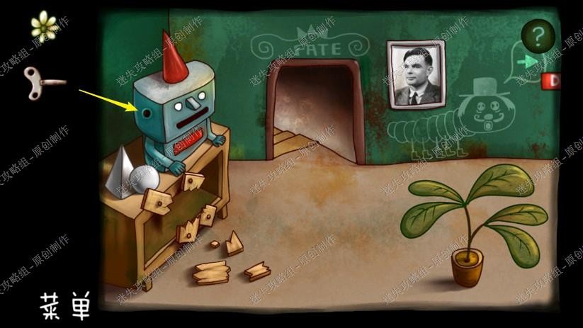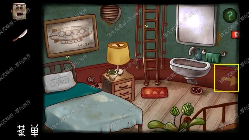 2. 我们点梯子上去,用密码打开左边的箱子,拿到机器人的头和日记碎片,在右边地板上捡起小刀,然后点击大苍蝇,它给了苹果的提示,下楼去另一个房间。