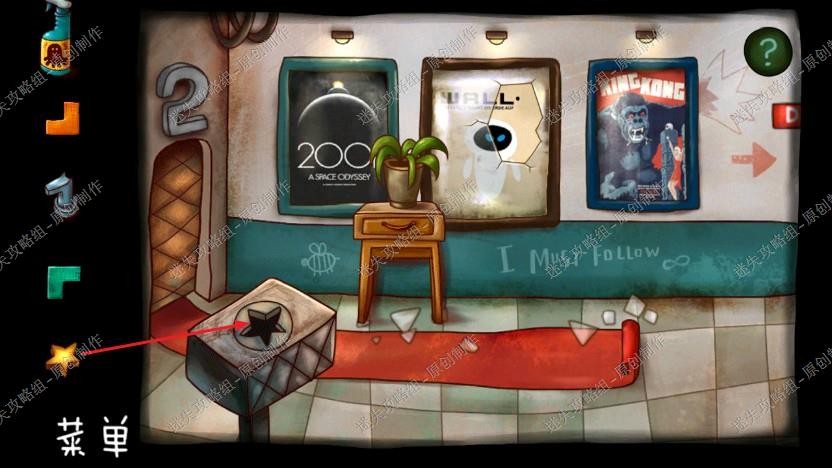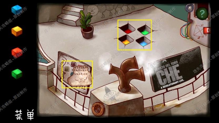6. 我们在电影院中点击后面的录影带,看影像中猩猩拍碎飞机的颜色顺序,得到密码3蓝4黄1青2红-青红蓝黄,把左上角的日记拿了,在录像带左边拿到红色积木,左边上二楼。