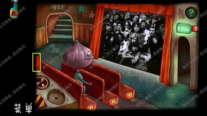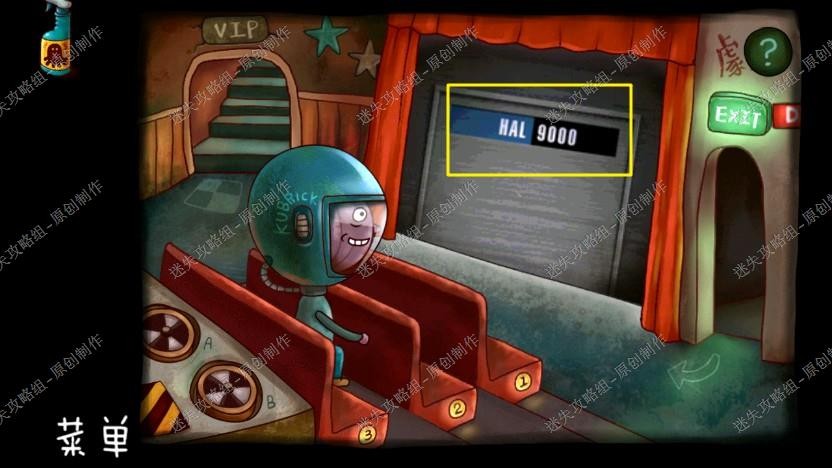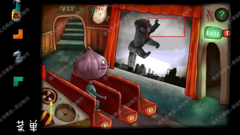 8. 把墙上的日记拿走,在装置里放入积木开始游戏,完成游戏后拿到头盔,回到电影院把头盔给洋葱人,拿到第二个录像带放入后面,看到屏幕里密码9000。
