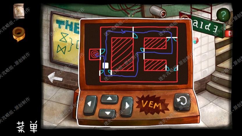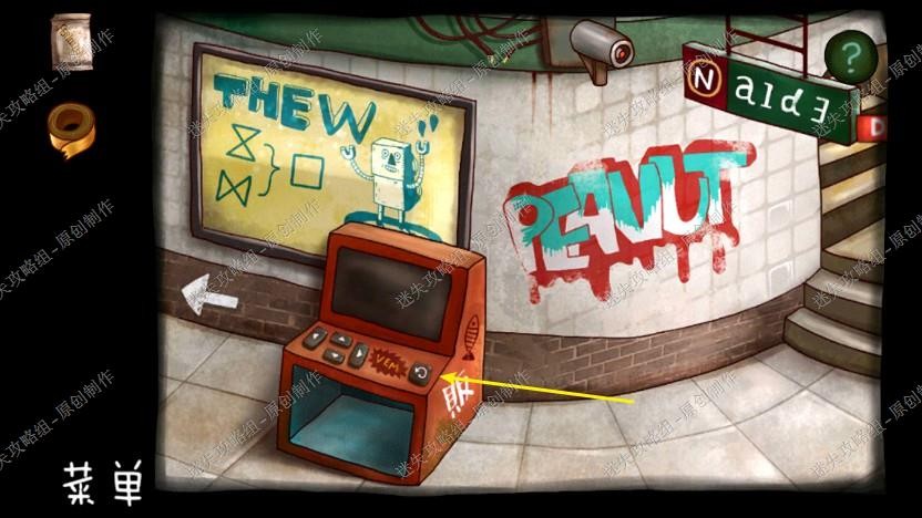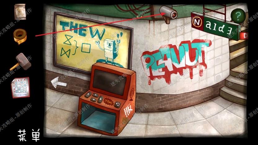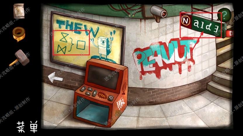13. 我们回到章鱼所在之处,接着进入塔内,这时看到了草莓小姐,先别理会她,径直往下走。在下方有个游戏机,完成上面的游戏后,能拿到锤子。用胶带把摄像头修复好,同时要留意左边的海报以及右上角的牌子,上面写着“N=a1d3”,记住这个内容。