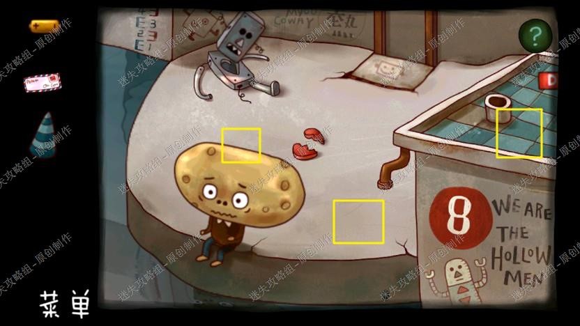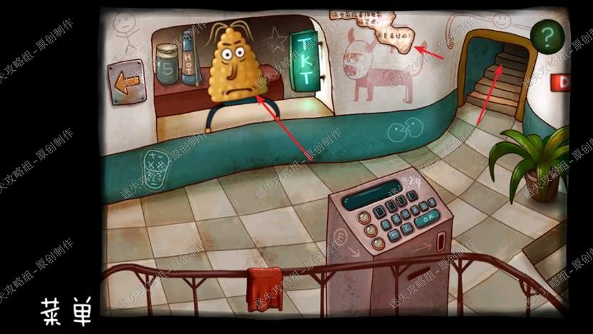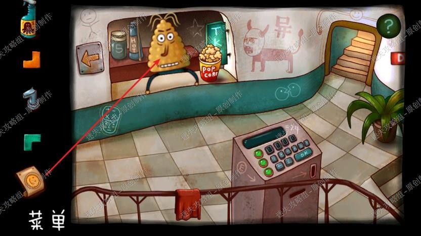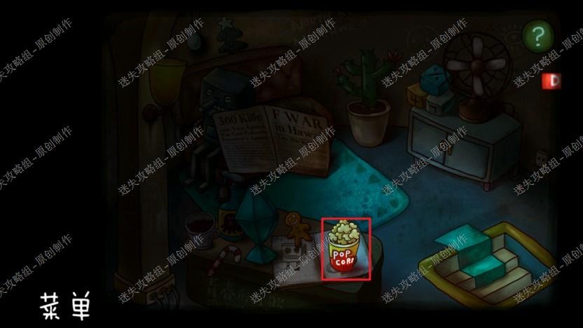 1. 点击玉米人,他要爆米花,右边墙上拿到日记上楼,拿到爆米花给他,他会把楼上的灯打开。