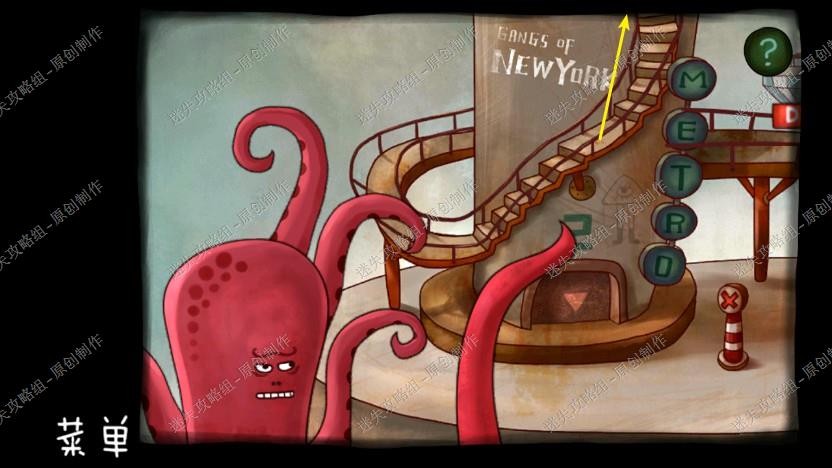 11. 来到新场景,先往左发现一只大章鱼,他想要帽子,我们上灯塔,在雕塑上拿到帽子和日记,把帽子给章鱼可以打开下面的门,先不管回到之前的场景。