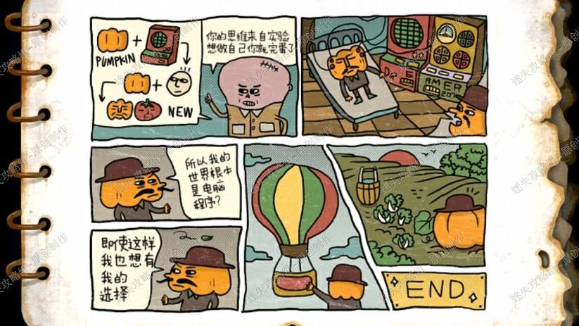 16. 到了顶上,把记忆捡起,输入密码拿到小刀,回到机器人的过道,用小刀划开海报,把雕像头扔进去,南瓜先生变成了灰色,跳到了热气球上完结。